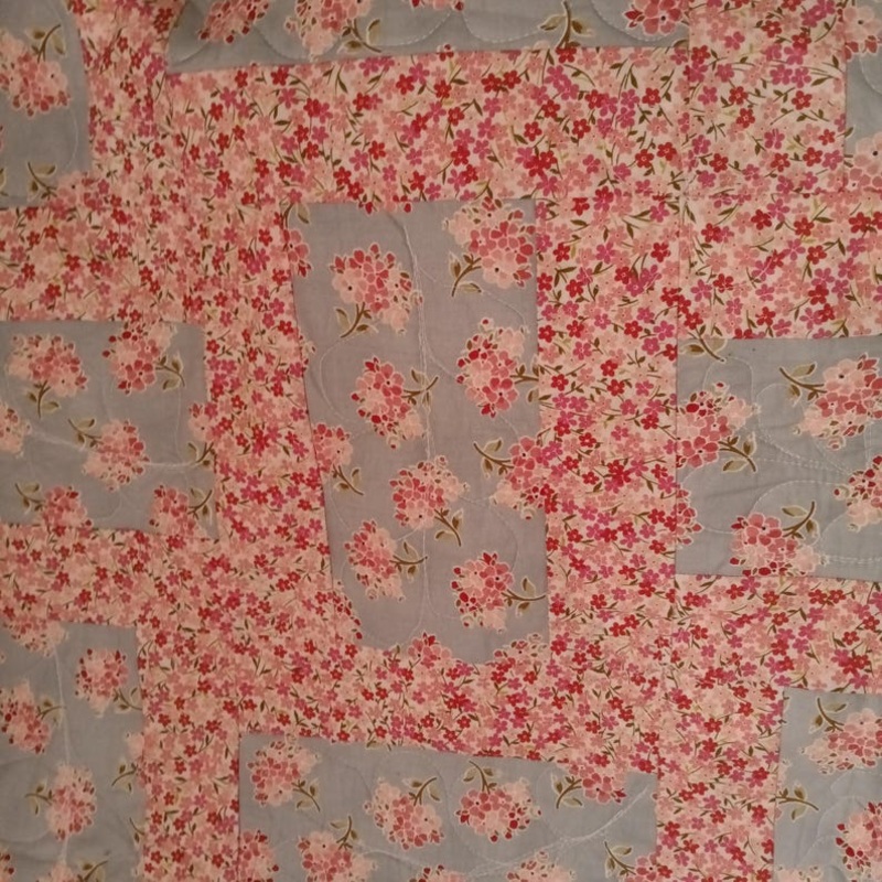 Gorgeous handmade light pink and baby blue floral quilt. Flannel floral backing. 47x40 inches. Very traditional!