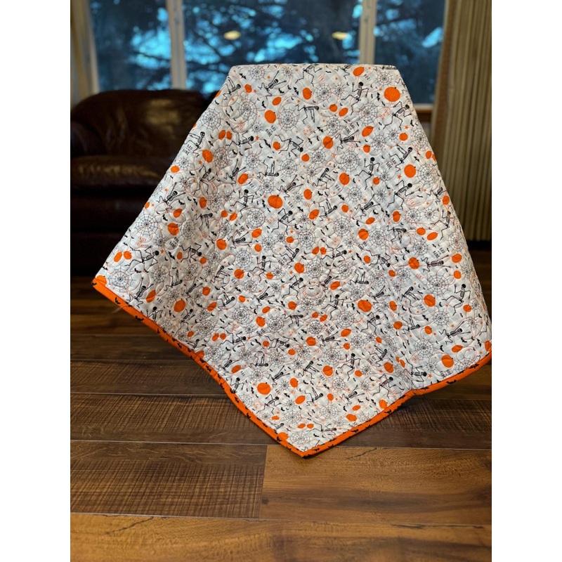 This handmade, machine quilted baby/toddler blanket is a generous sized 42×42″ wholecloth quilt. The fabric is cotton and flannel with soft heirloom cotton batting. The front fabric is a soft grey gingham with dancing skeletons, pumpkins, and bats in black and orange. The back of the quilt is a soft grey flannel with a coordinating orange and black bat binding.